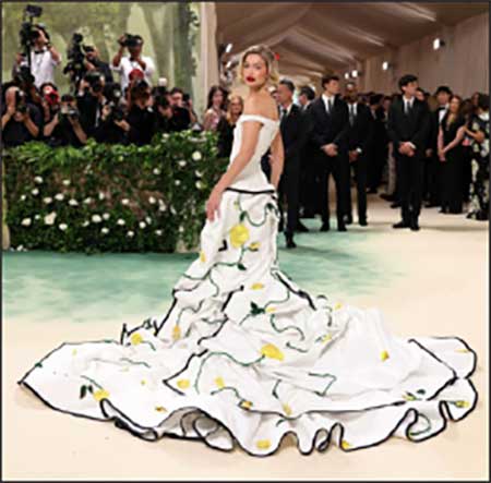 أما الممثلة زندايا فاختارت على غرار باد باني تصميماً لجون غاليانو (دار مارغيليا)، هو عبارة عن فستان مموج بين الأزرق الغامق ولون الزمرد، ووضعت على رأسها إكسسواراً يتضمّن ريشاً. وظهرت النجمة الأميركية بإطلالة ثانية ارتدت خلالها فستاناً أسود واعتمرت قبعة عليها ورود ملوّنة.